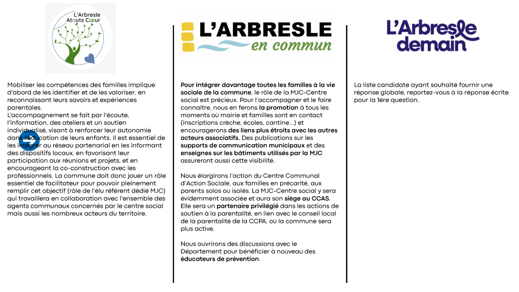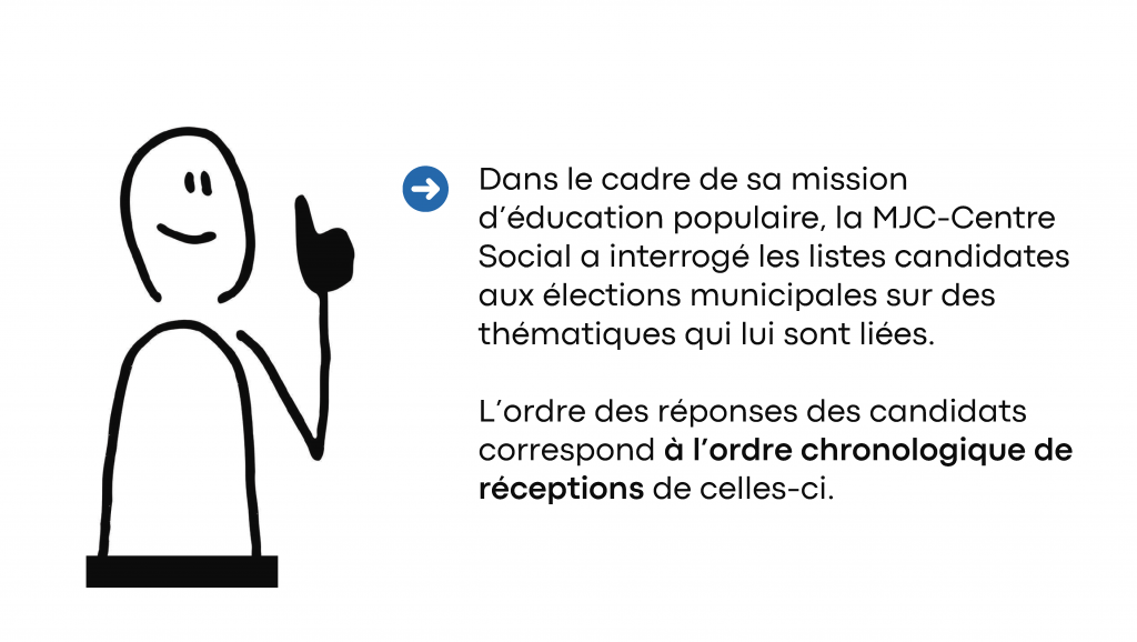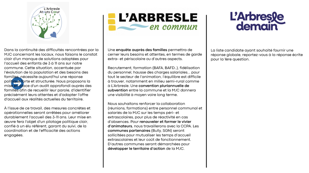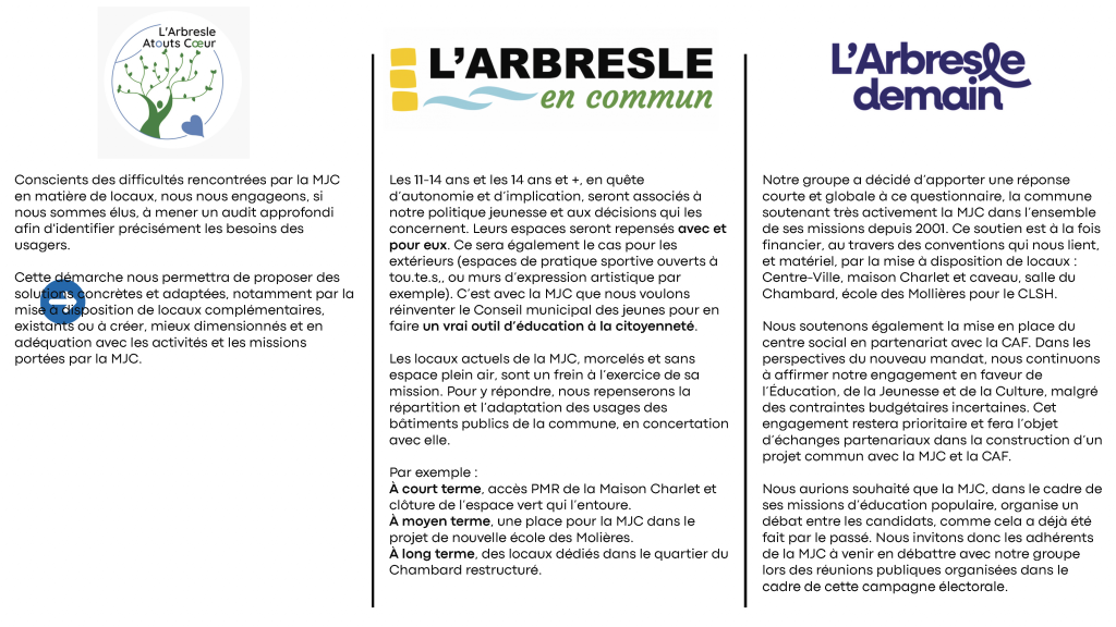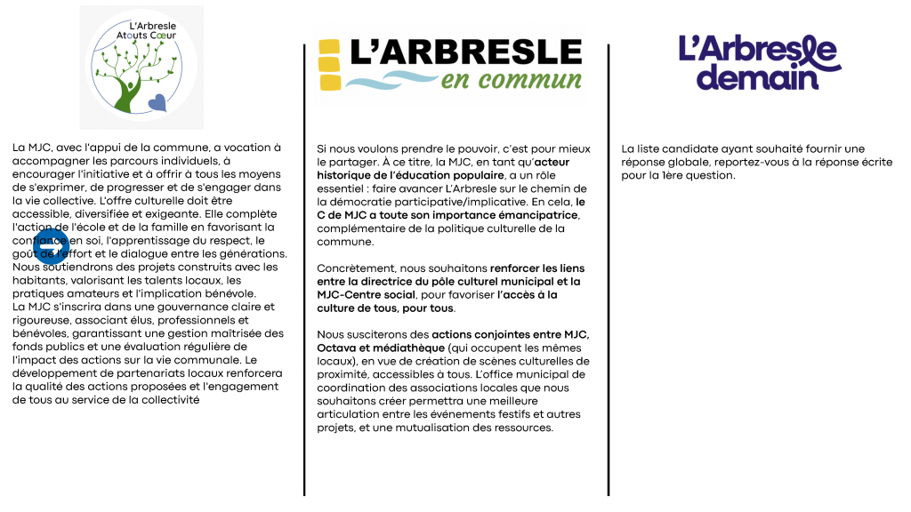 Avec sa permission, nous nous permettons de publier le document de la MJC qui met en parallèle toutes les réponses reçues, identifiables par le logo de chaque liste.