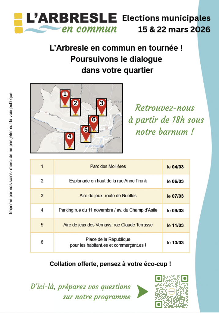 Au lieu de vous convier à vous déplacer à la salle des fêtes pour une traditionnelle réunion publique de fin de campagne, nous préférons, une fois de plus, venir à votre rencontre.